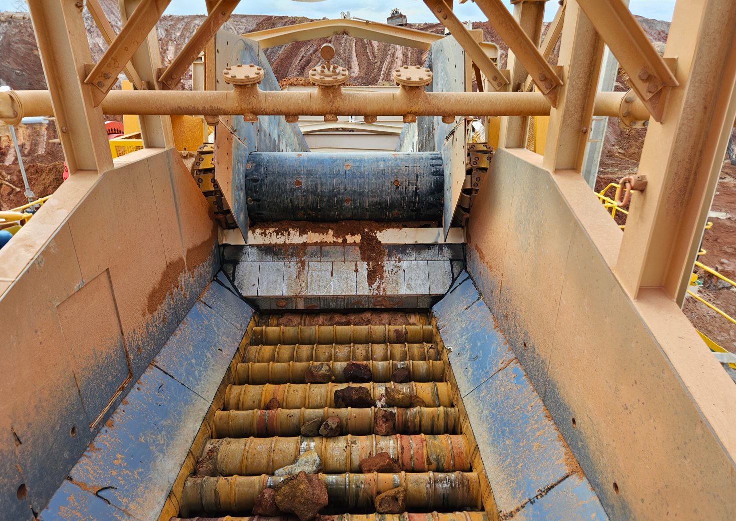 The Wobbler Feeder consists of a frame, elliptical bars and a chain drive system used to rotate the bars. The bars are elliptical in shape and are timed at 90 degrees to the adjoining bar. The drive system connects all the bars with a double- or triple-strand chain that attaches to sprockets on each bar, maintaining the 90 degree timing. This maintains the gap, or opening, between the bars at the same dimension throughout the bar rotation. As material is moved from the feed end to the discharge end, the large lumps of material are forced up and down within the load, scrubbing against each other. This action forces any sticky material, such as clay, to be dislodged and enables it to pass through the openings between the bars. The rotation of the bars also moves the material from the feed end to the discharge end with continuous scrubbing the full distance.